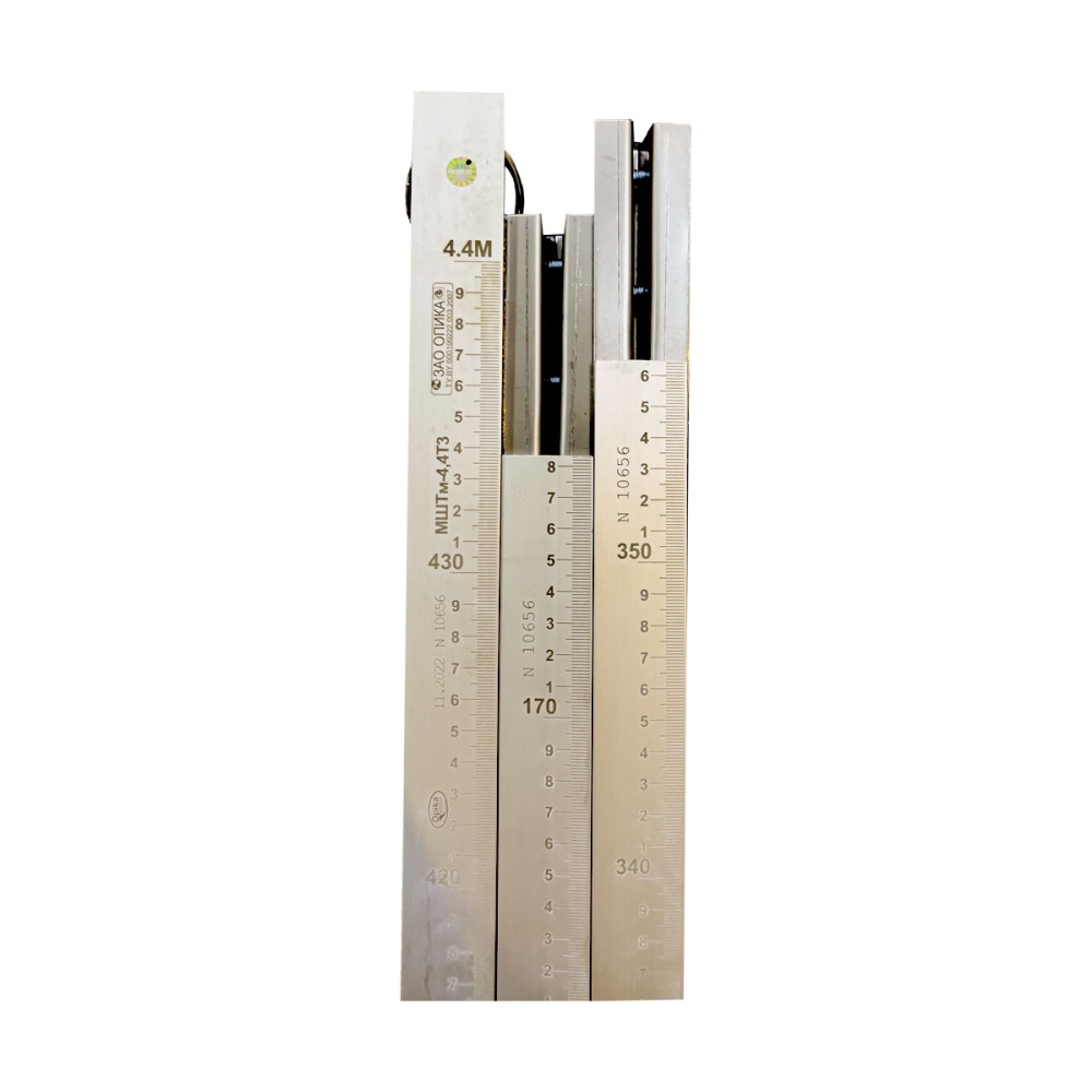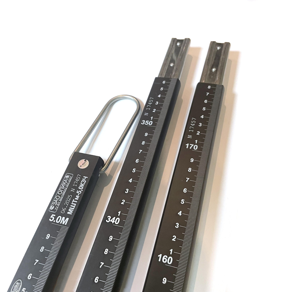 МШТм - метроштоки, разработанные для измерения уровня нефтепродуктов и иных неагрессивных жидкостей в ёмкостях. Данные метроштоки имеют несколько модификаций, различающихся длиной, количеством звеньев, материалом изготовления, формой профиля, наличием анодированного покрытия. При измерении уровня нефтепродуктов используется бензочувствительная паста (например бензочувствительная паста Gasoila, артикул DGGP25), изменяющая свой цвет в местах соприкосновения с нефтепродуктом, позволяя визуально оценить уровень заполненности ёмкости. Также часто метроштоки МШТм используются чтобы определить уровень подтоварных вод, в этом случае на нижнюю часть шкалы метроштока наносится тонким слоем специальная водочувствительная паста (например водочувствительная паста Gasoila, артикул QDFP25), изменяющая свой цвет при соприкосновении с водой. Самый короткий метрошток - МШТм-1,0 обладает шкалой 1000 мм (габаритные размеры 1180 мм), данный метрошток цельный, то есть состоит из одного звена. Метроштоки с более длинными шкалами состоят из двух, трёх или четырёх частей. Наиболее длинной шкалой (6000 мм) обладает метрошток МШТм-6,0, который может состоять из трёх или четырёх частей. Метроштоки могут изготавливаться с двумя вариантами профилей сечения - таврового сечения (в наименовании модели используется буква Т) и полукруглого сечения (в наименовании модели - буква К). Метроштоки МШТм могут изготавливаться из алюминия (для нефтепродуктов) нержавеющей стали (для пищевых продуктов). Алюминиевые метроштоки также могут иметь покрытие чёрного цвета, получаемое методом анодирования, в этом случае в название модели метроштока добавляется буква Ч. Метроштоки из специальной пищевой нержавещей стали содержат в наименовании модели указание марки стали - AISI 304. Таким образом, наименование модели МШТм содержит указание длины шкалы в метрах, тип профиля сечения (К - полукруглый, Т - тавровый), количество звеньев, указание на наличие чернения (буква Ч) либо марку стали (AISI 304). Например, метрошток МШТм-4,4К3Ч - метрошток с длиной шкалы 4,4 метра, с полукруглым профилем сечения, состоящий из трёх звеньев, чернёный.